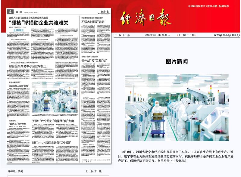 我司于2月10日起有序復工,新華社、經(jīng)濟日報、四川日報同時(shí)刊發(fā)稿件!利普芯董事會(huì )感謝所有在疫情阻擊戰中保生產(chǎn)的員工!